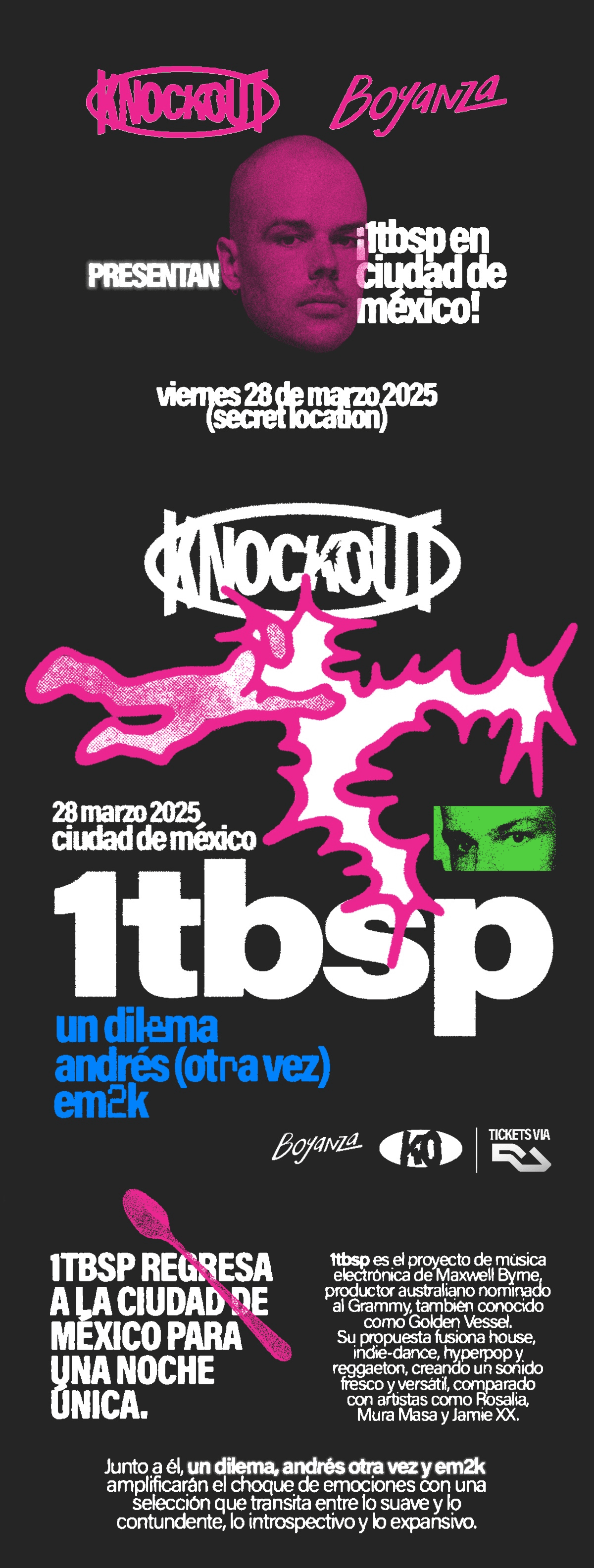 🚀 Con una mezcla única de house, indie-dance, hyperpop y reggaetón, 1tbsp ha conquistado escenarios y playlists globales, siendo comparado con gigantes como Rosalía, Mura Masa y Jamie xx. Su más reciente álbum, «megacity1000», nos transporta a un universo sonoro vibrante, repleto de beats envolventes y sintetizadores electrificantes.
