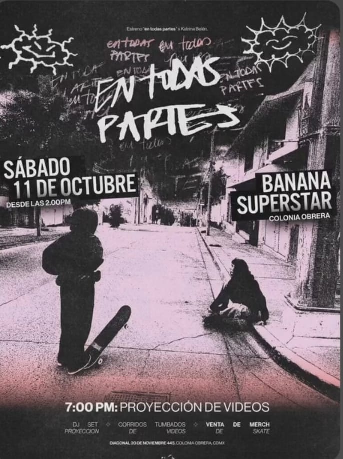 El pasado sábado 11 de octubre, la escena skate y rollerquad se reunió en Banana Superstar (Colonia Obrera) para el estreno de «En todas partes», un video de Katrina Belén que celebra la energía, diversidad y resistencia de las chicas que patinan las calles de la CDMX.