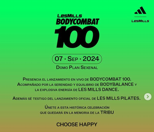 Prepárate para vivir un momento épico con el relanzamiento en vivo de BODYCOMBAT 100, una celebración sin precedentes en la que el poder y la energía de esta disciplina se llevarán a nuevas alturas. Acompañado por la serenidad y equilibrio de BODYBALANCE, la explosiva energía de LES MILLS DANCE, y el estreno del emocionante LES MILLS PILATES, este evento es una oportunidad única para sumergirte en lo mejor del fitness.