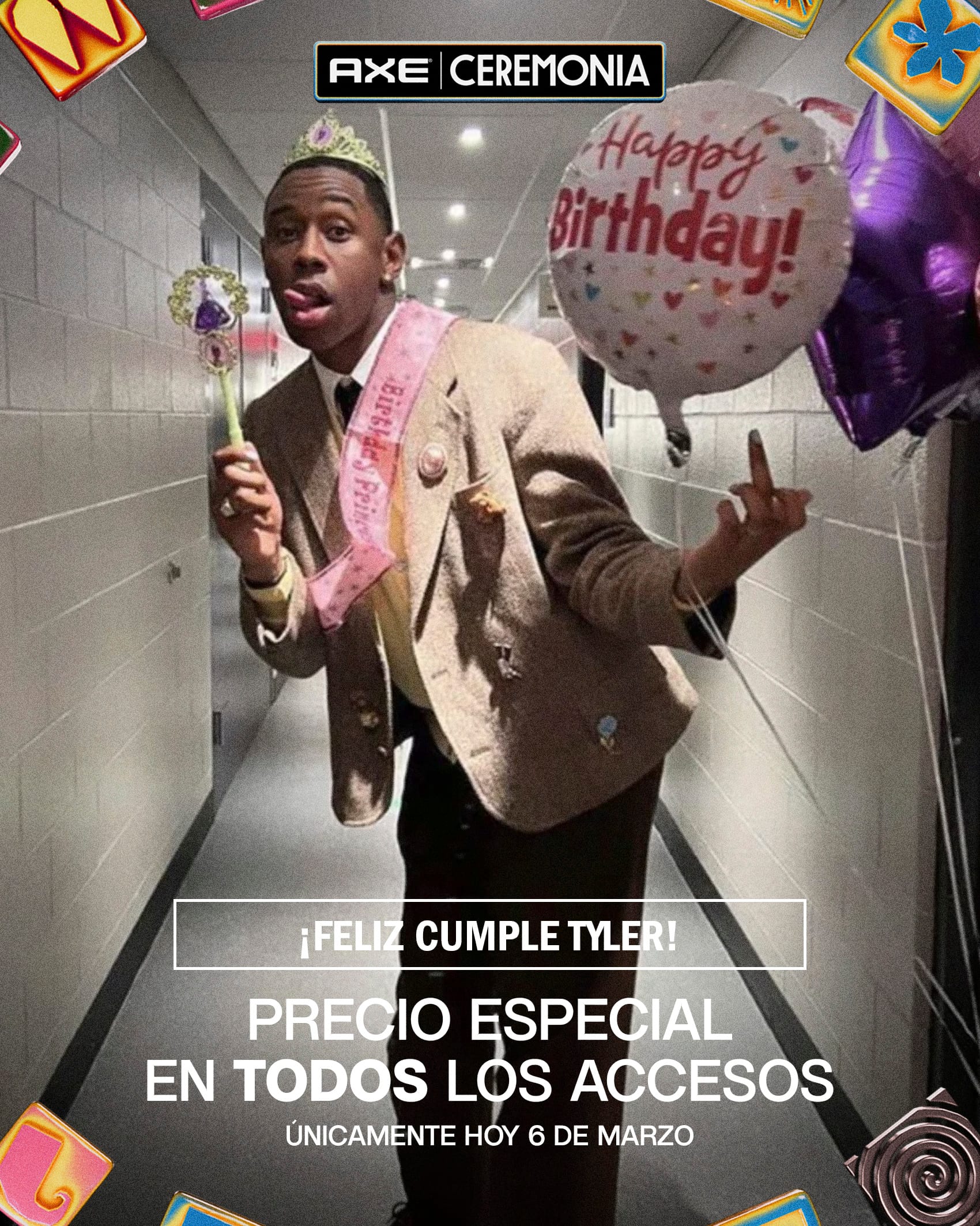 Feliz cumpleaños, Tyler. Hoy se celebra con música, vibras altas y precios especiales. Nos vemos en AXE Ceremonia.